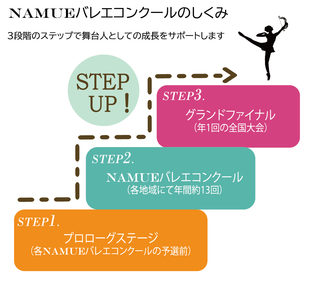 NAMUEが皆さまにご提案するすべてのステージは、習熟度にかかわらず、現在の自分に挑戦し、更なる一歩を進める全てのバレリーナたちのチャレンジ精神を応援するものです。
